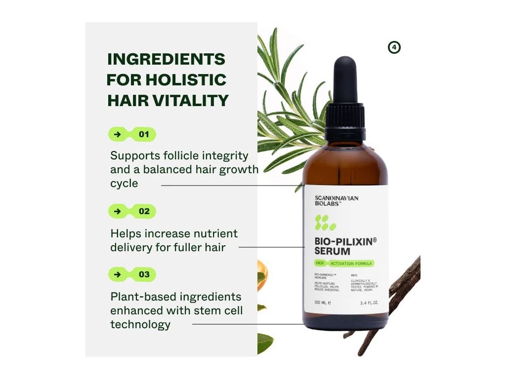 Bio-Pilixin® Serum bylo vyvinuto odborníky za účelem snížení vypadávání vlasů a podpory růstu nových vlasů. Obsahuje několik růstových faktorů z rostlin, vyvinutých pomocí technologie kmenových buněk, které vyživují vlasové folikuly a podporují růst vlasů. Výsledky klinického testování jsou viditelné již po 45 dnech používání, s 93% spokojeností uživatelů. Toto sérum je bezpečné pro každodenní použití. Jeho patentovaná formule nejen že chrání vlasy před poškozením a posiluje jejich strukturu, ale také stimuluje vlasové folikuly a dodává jim potřebné živiny.